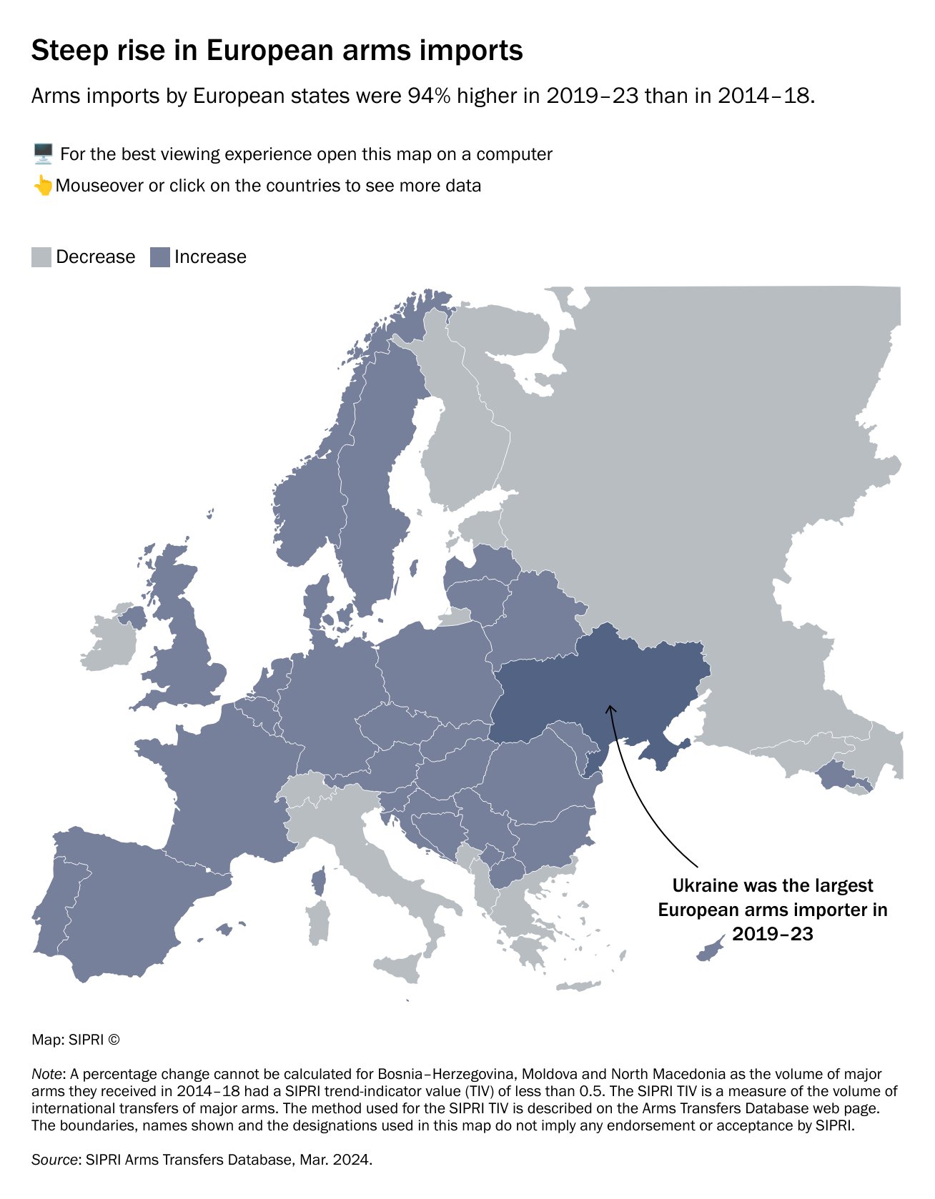 Οι εισαγωγές όπλων από τα ευρωπαϊκά κράτη ήταν 94% υψηλότερες το 2019-23 σε σχέση με το 2014-18. Η Ουκρανία αναδείχθηκε ο μεγαλύτερος Ευρωπαίος εισαγωγέας όπλων το 2019-23 και ο τέταρτος μεγαλύτερος στον κόσμο, αφού τουλάχιστον 30 κράτη προμήθευσαν μεγάλα όπλα ως στρατιωτική βοήθεια στην Ουκρανία από τον Φεβρουάριο του 2022.