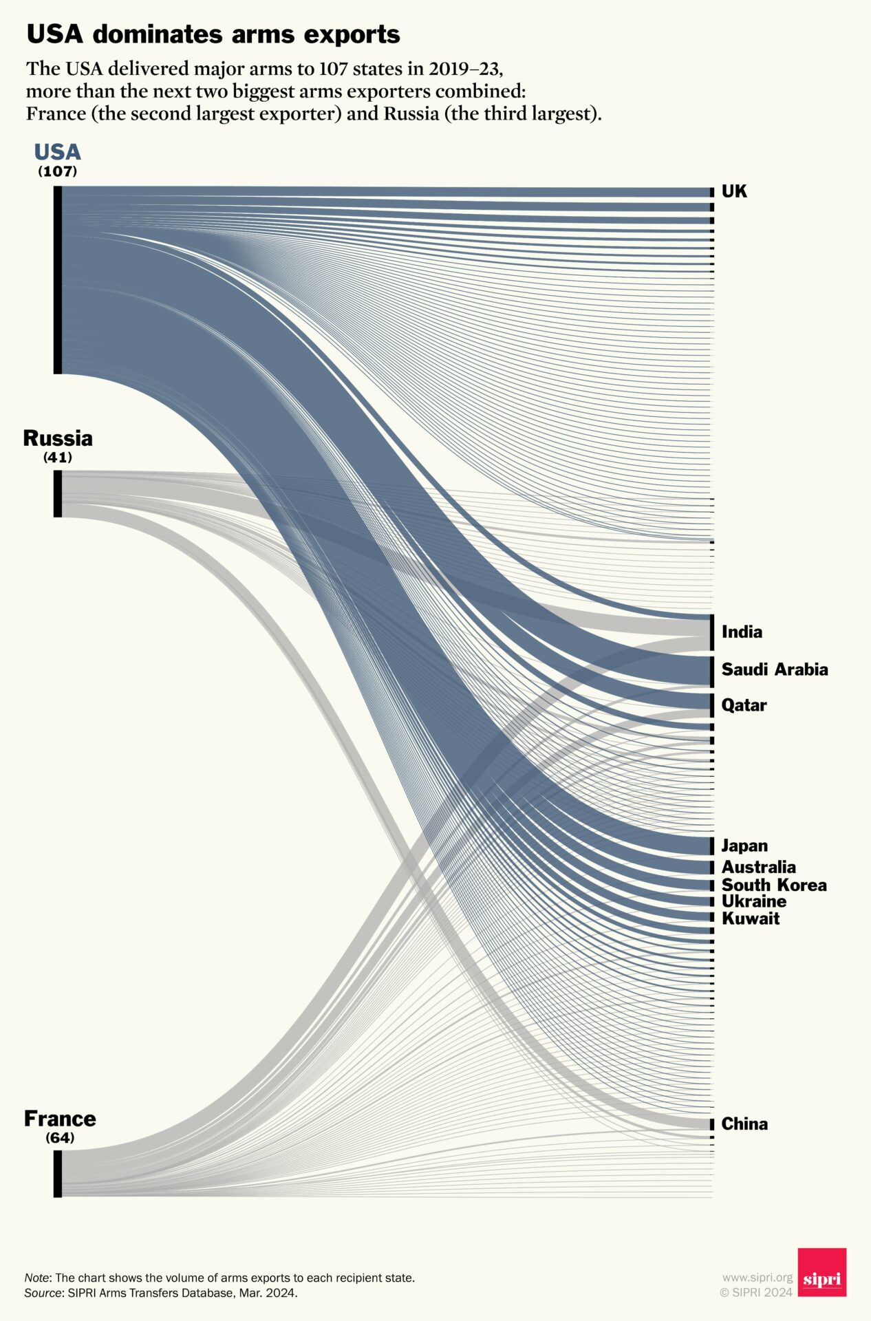 Οι εξαγωγές όπλων των ΗΠΑ αυξήθηκαν κατά 17% μεταξύ 2014-18 και 2019-23 και το μερίδιό τους στις συνολικές παγκόσμιες εξαγωγές όπλων αυξήθηκε από 34% σε 42%. Οι ΗΠΑ παρέδωσαν μεγάλα όπλα σε 107 κράτη την περίοδο 2019-23, περισσότερα από ό,τι σε οποιαδήποτε προηγούμενη πενταετία και πολύ περισσότερα από οποιονδήποτε άλλο εξαγωγέα όπλων. Οι ΗΠΑ και τα κράτη της Δυτικής Ευρώπης αντιπροσώπευαν από κοινού το 72% του συνόλου των εξαγωγών όπλων την περίοδο 2019-23, σε σύγκριση με το 62% την περίοδο 2014-18.