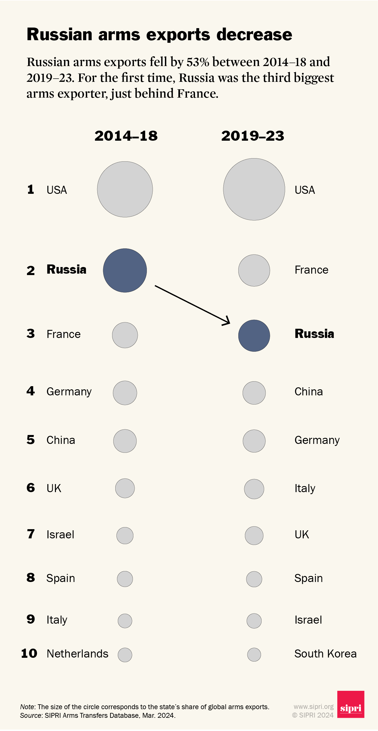 Η Ρωσία ήταν για πρώτη φορά ο τρίτος μεγαλύτερος εξαγωγέας όπλων, πέφτοντας στην κατάταξη πίσω από τη Γαλλία.