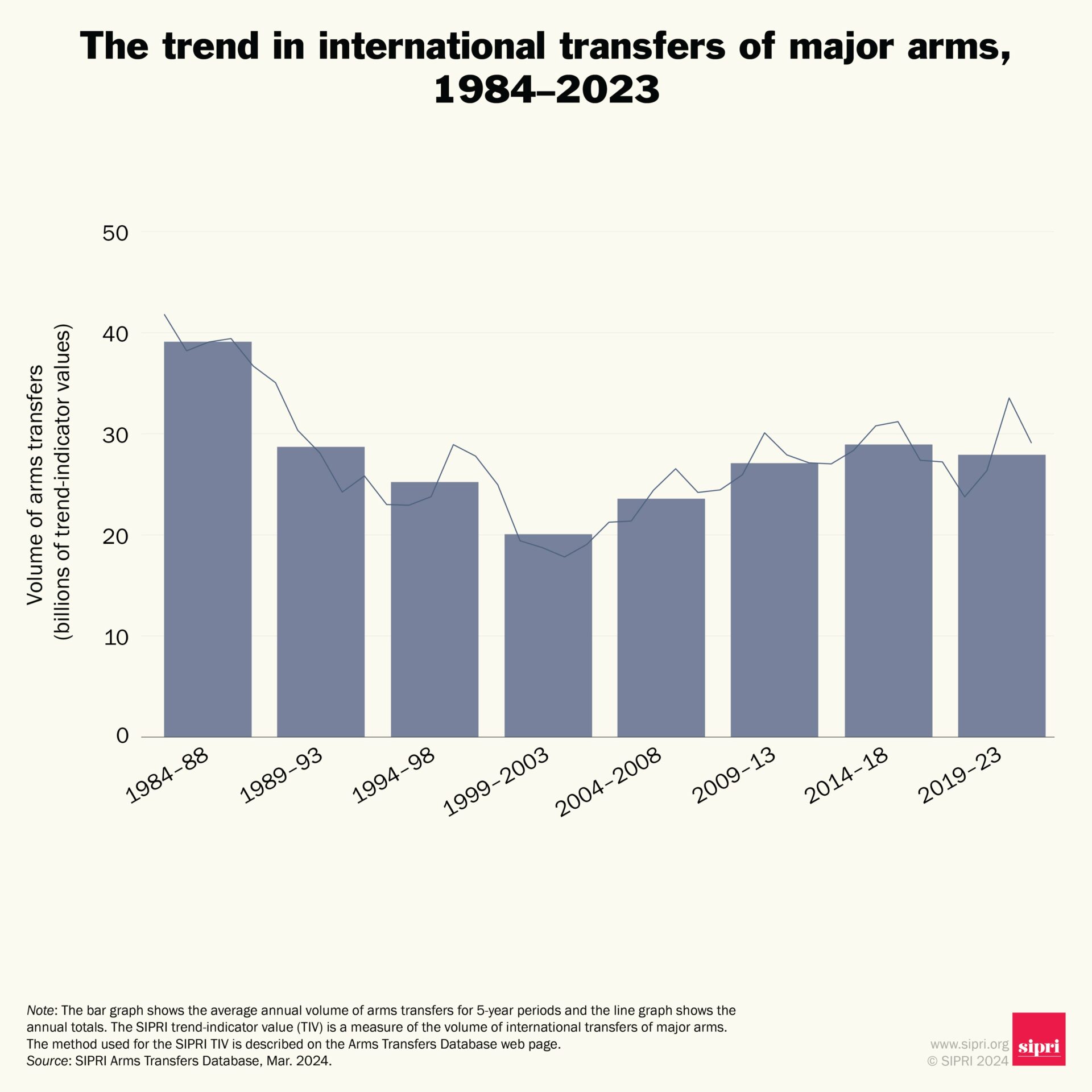 Ο παγκόσμιος όγκος των διεθνών μεταφορών όπλων μειώθηκε ελαφρώς κατά 3,3% μεταξύ 2014-18 και 2019-23, σύμφωνα με τα νέα στοιχεία για τις διεθνείς μεταφορές όπλων που δημοσίευσε το Διεθνές Ινστιτούτο Ερευνών για την Ειρήνη της Στοκχόλμης (SIPRI).