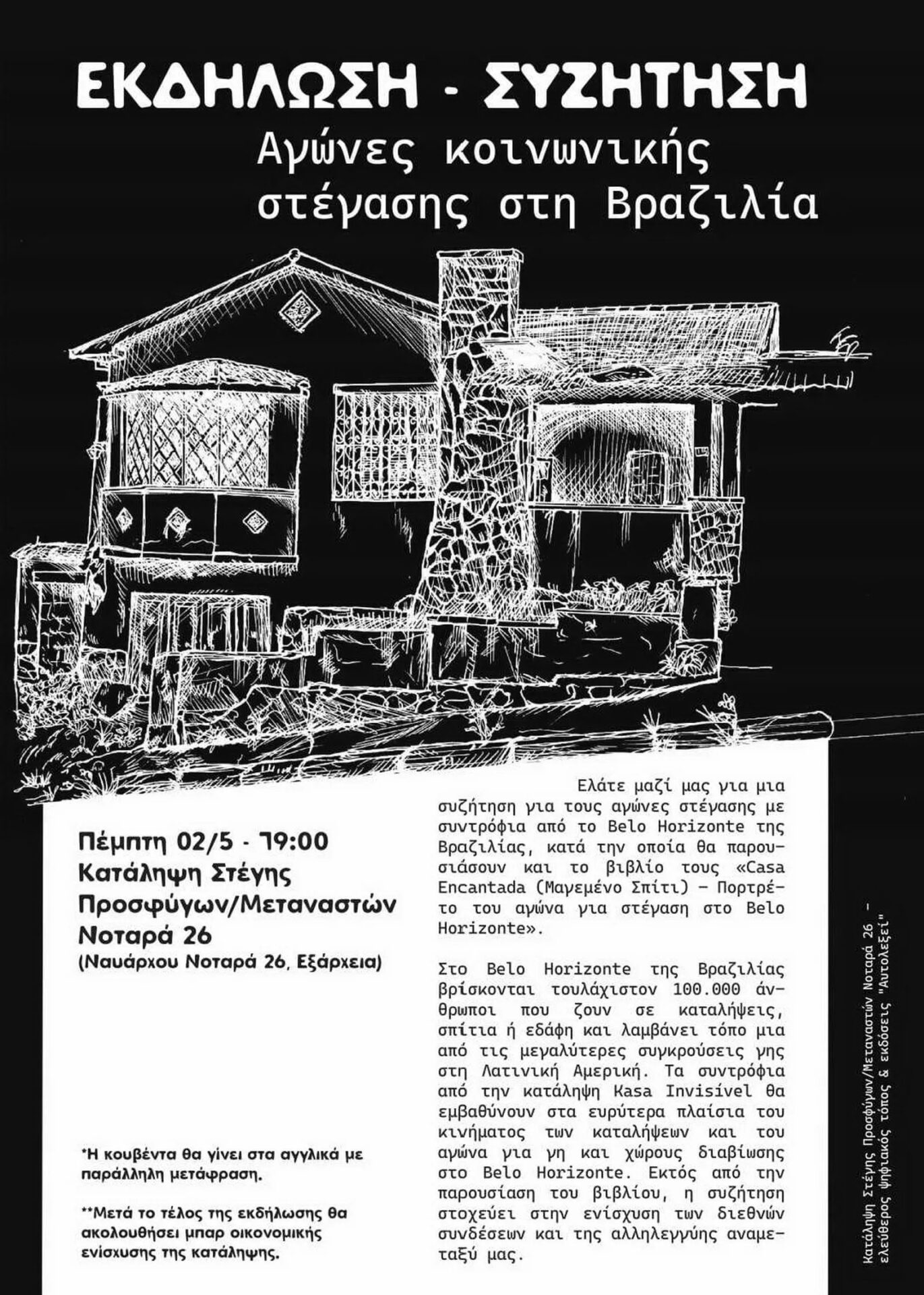 Ελάτε μαζί μας σε μια συζήτηση για τους αγώνες στέγασης με συντρόφια από το Belo Horizonte της Βραζιλίας, που βρίσκονται σε ευρωπαϊκή περιοδεία. Κατά τη διάρκεια της εκδήλωσης, θα μας παρουσιάσουν το νέο τους βιβλίο “Casa Encantada (Μαγεμένο Σπίτι) – Πορτρέτο του αγώνα για στέγαση στο Belo Horizonte”.