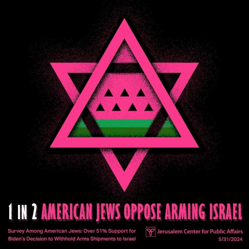 Έρευνα μεταξύ των Αμερικανών Εβραίων από το Κέντρο Δημοσίων Υποθέσεων της Ιερουσαλήμ στις 31/5/2024 δείχνει ότι πάνω από 51% υποστηρίζουν την απόφαση του Μπάιντεν να αναστείλει τις αποστολές όπλων στο Ισραήλ. Σύμφωνα με πρόσφατες μελέτες, τουλάχιστον οι μισοί από τους Αμερικανούς Εβραίους επιθυμούν να επιβληθεί εμπάργκο όπλων στον ισραηλινό στρατό. Η ανάγκη για δράση είναι επείγουσα και ξεκάθαρη: είναι καιρός το Κογκρέσο να καλέσει τον Πρόεδρο Μπάιντεν να σταματήσει αμέσως τη ροή των όπλων προς το Ισραήλ.