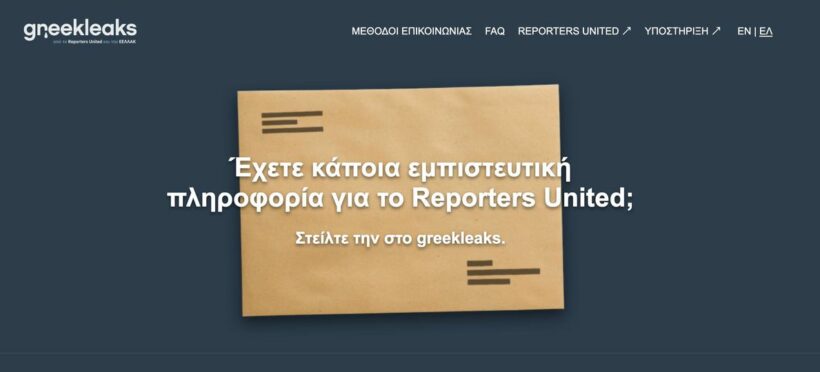 To greekleaks είναι μια online πλατφόρμα που δίνει τη δυνατότητα στους πολίτες να επικοινωνήσουν και να στείλουν με ανωνυμία και ασφάλεια μηνύματα ή/και υλικό (έγγραφα, βίντεο, ηχητικά, φωτογραφίες, κτλ.) ή απλώς πληροφορίες στους δημοσιογράφους του Reporters United.
