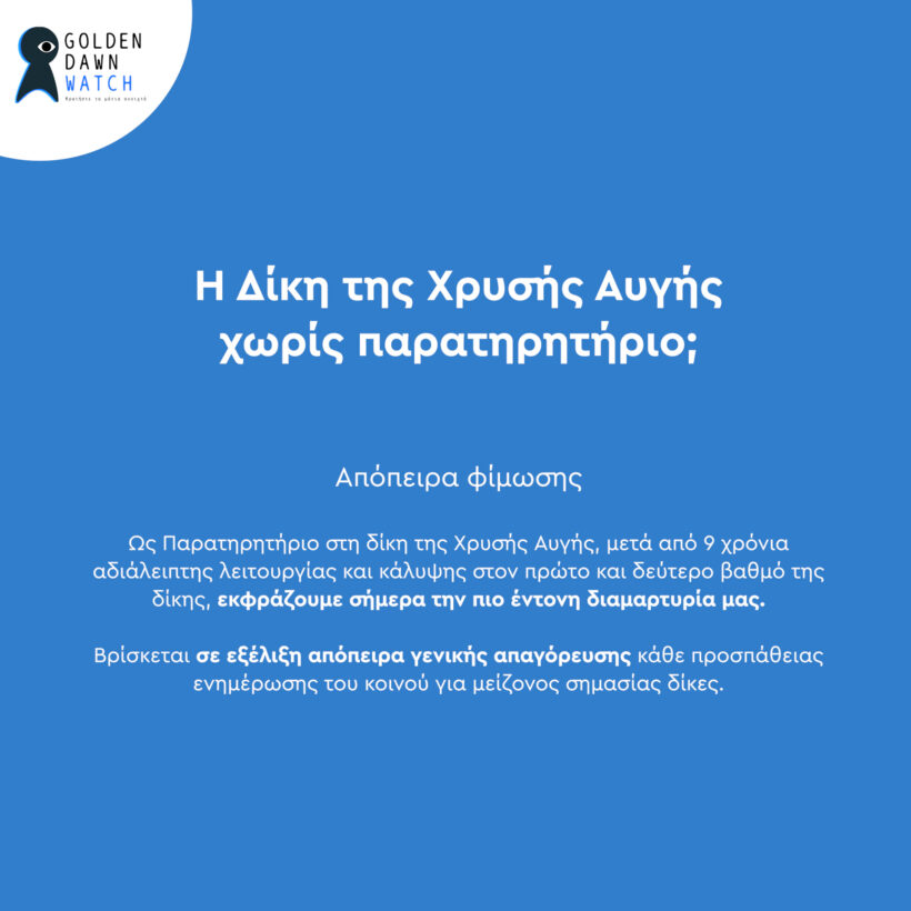 Ως Παρατηρητήριο στη δίκη της Χρυσής Αυγής, μετά από 9 χρόνια αδιάλειπτης λειτουργίας και κάλυψης στον πρώτο και δεύτερο βαθμό της δίκης, εκφράζουμε σήμερα την πιο έντονη διαμαρτυρία μας. Βρίσκεται σε εξέλιξη απόπειρα γενικής απαγόρευσης κάθε προσπάθειας ενημέρωσης του κοινού για μείζονος σημασίας δίκες. Αυτή η ενημέρωση υπήρξε από την πρώτη στιγμή η μέγιστη προτεραιότητά μας, γεγονός που αναγνωρίστηκε σε εθνικό και διεθνές επίπεδο ως βέλτιστη πρακτική (best practice) και ως εχέγγυο διαφάνειας και λογοδοσίας, σημείο που ως γνωστό αποτελεί κομβικό σημείο του κράτους δικαίου για το οποίο η χώρα μας ελέγχεται από διεθνή όργανα. Εξάλλου, αντίστοιχα σημαντικό έργο έχουν προσφέρει και προσφέρουν και άλλα Παρατηρητήρια σε σημαντικές δίκες.