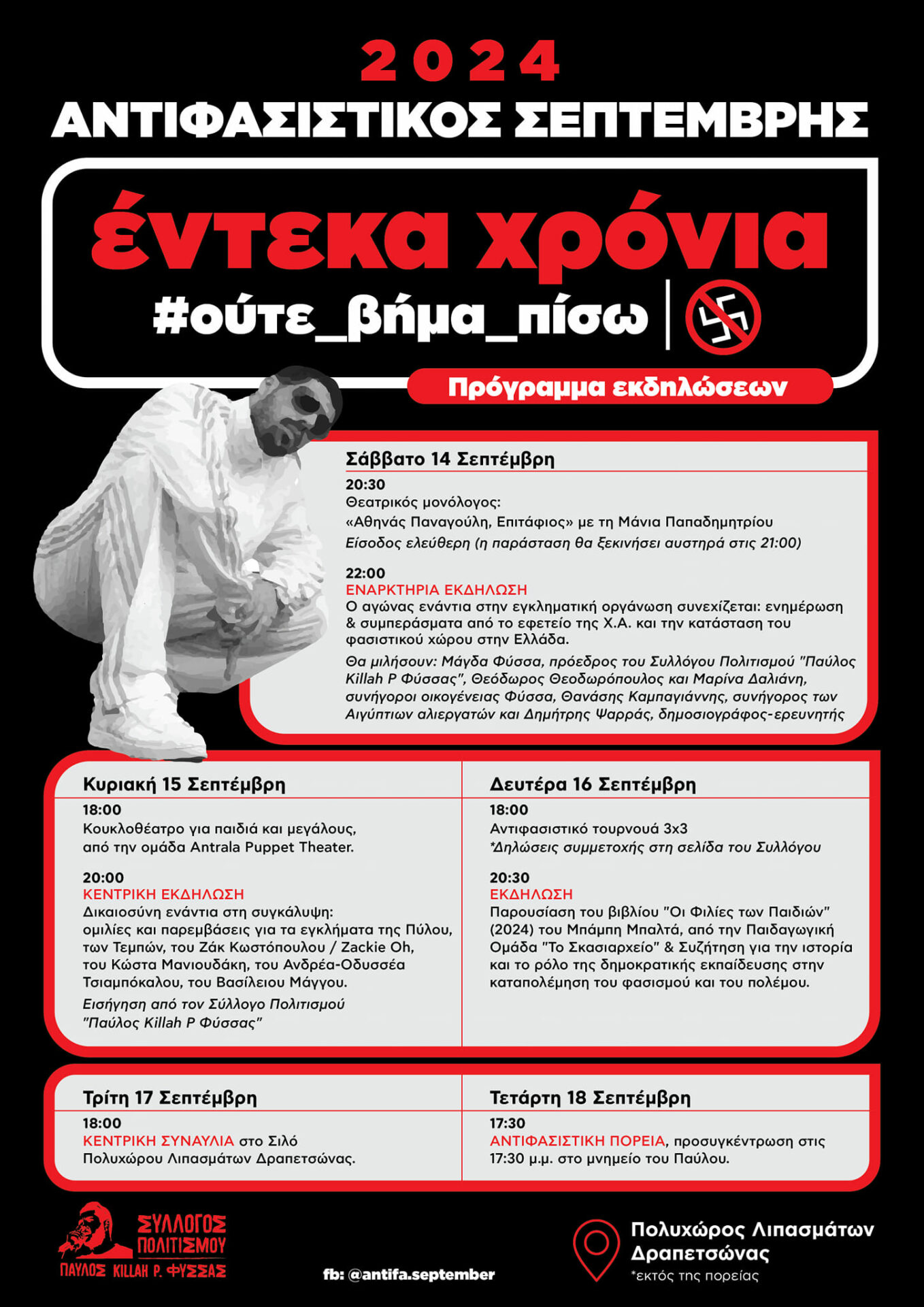 11 χρόνια κλείνουν φέτος από τη δολοφονία του Παύλου Φύσσα από το τάγμα εφόδου της Χρυσής Αυγής. Ο Σύλλογος Πολιτισμού «Παύλος Killah P Φύσσας» διοργανώνει και φέτος τον Αντιφαστιστικό Σεπτέμβρη από το Σάββατο 14 Σεπτεμβρίου μέχρι και την Τετάρτη 18 Σεπτεμβρίου όπου και θα πραγματοποιηθεί η αντιφασιστική πορεία.