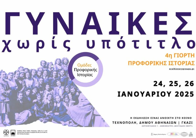 Η 4η Γιορτή Προφορικής Ιστορίας με θέμα ΓΥΝΑΙΚΕΣ – «χωρίς» υπότιτλο θα πραγματοποιηθεί στην Τεχνόπολη του Δήμου Αθηναίων (Αεροφυλάκιο 1, Αμφιθέατρο «Μιλτιάδης Έβερτ»). Η διάρκεια της γιορτής θα είναι τρεις ημέρες, από την Παρασκευή 24 Ιανουαρίου έως και την Κυριακή 26 Ιανουαρίου.