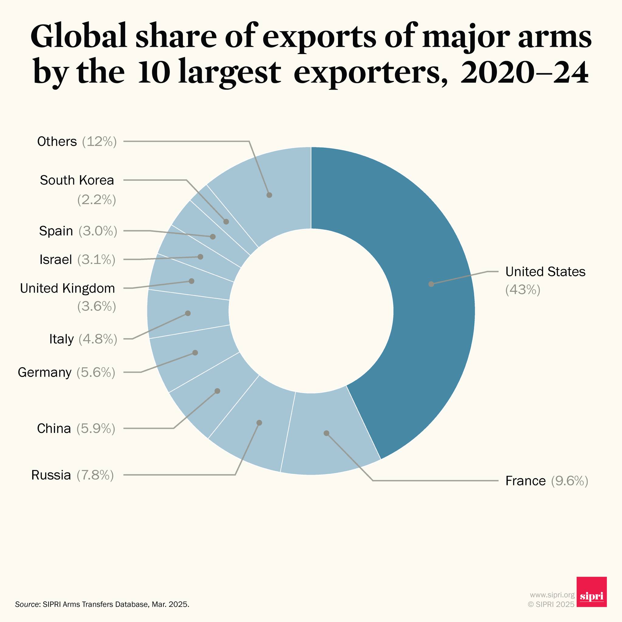 Οι 10 κορυφαίοι εξαγωγείς όπλων την περίοδο 2020-24 ήταν οι ίδιοι με εκείνους της περιόδου 2015-19, αλλά η Ρωσία (που αντιπροσωπεύει το 7,8% των παγκόσμιων εξαγωγών όπλων) έπεσε στην τρίτη θέση πίσω από τη Γαλλία (9,6%), ενώ η Ιταλία (4,8%) έκανε άλμα από τη 10η στην 6η θέση.