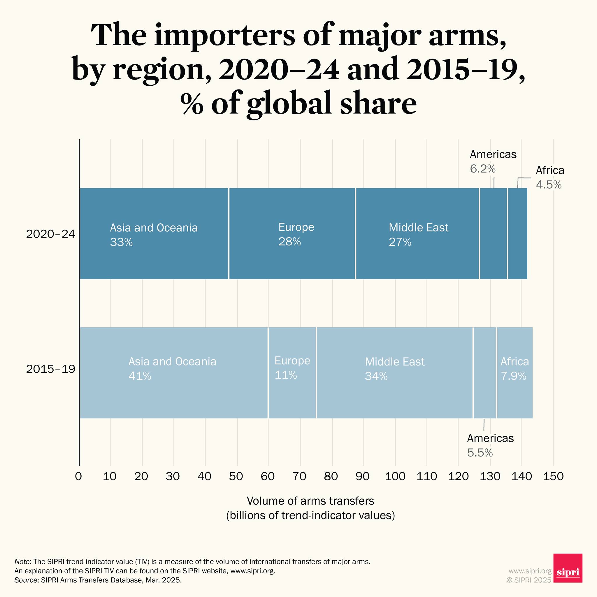 Για πρώτη φορά μετά από δύο δεκαετίες, το μεγαλύτερο μερίδιο των αμερικανικών εξαγωγών όπλων το 2020-24 πήγε στην Ευρώπη (35%) και όχι στη Μέση Ανατολή (33%). Παρ’ όλα αυτά, ο κορυφαίος μεμονωμένος παραλήπτης αμερικανικών όπλων ήταν η Σαουδική Αραβία (12% των αμερικανικών εξαγωγών όπλων).
