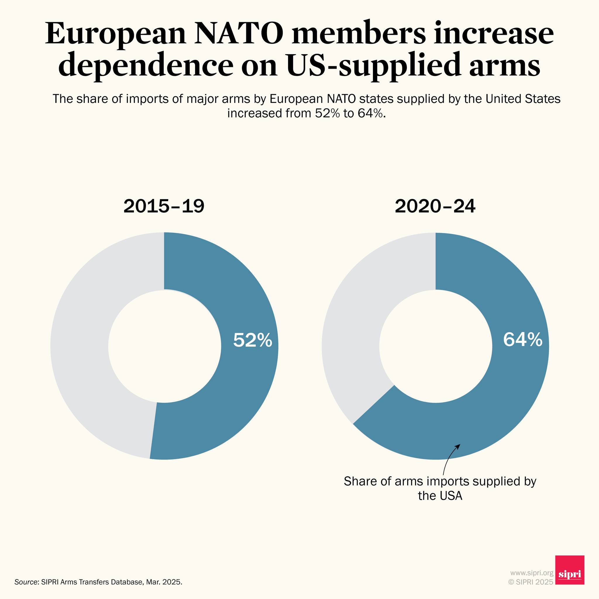 Οι εισαγωγές όπλων από τα ευρωπαϊκά μέλη του ΝΑΤΟ υπερδιπλασιάστηκαν μεταξύ 2015-19 και 2020-24 (+105%). Οι ΗΠΑ προμηθεύσαν το 64% αυτών των όπλων, ποσοστό σημαντικά μεγαλύτερο από ό,τι το 2015-19 (52%). Οι άλλοι κύριοι προμηθευτές ήταν η Γαλλία και η Νότια Κορέα (με ποσοστό 6,5% η καθεμία), η Γερμανία (4,7%) και το Ισραήλ (3,9%).