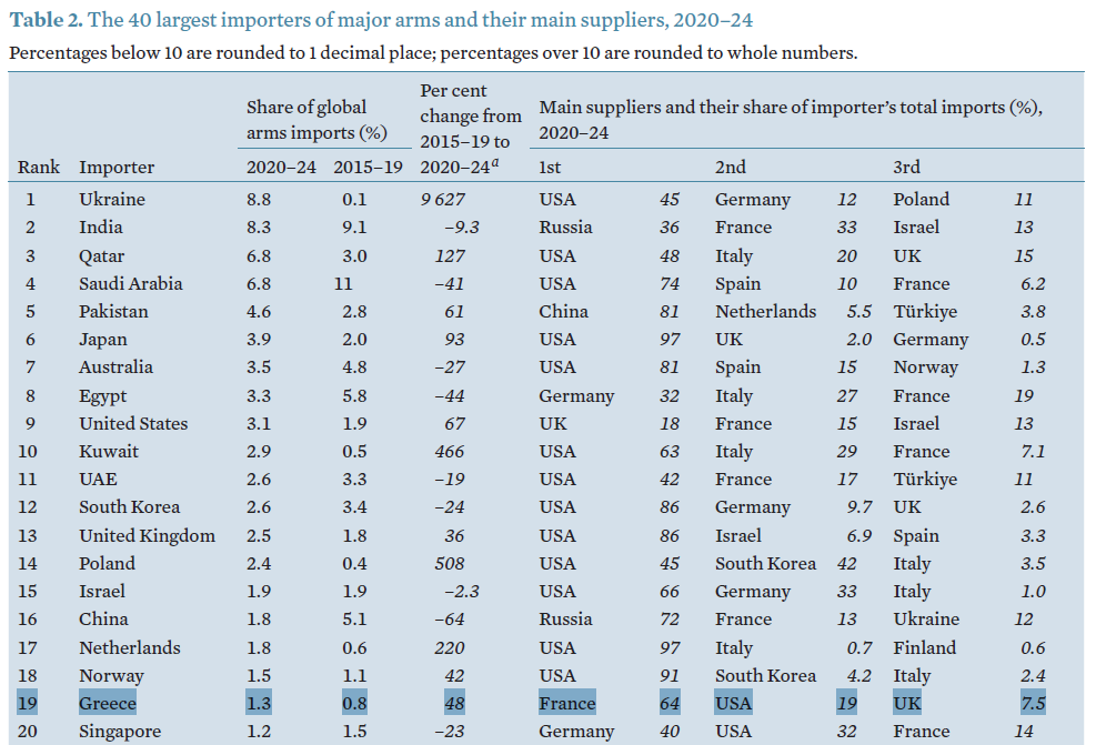 Η Ελλάδα κατά την περίοδο 2020-24 αύξησε τις εισαγωγές όπλων της κατά 48% σε σχέση με την περίοδο 2015-19 και βρίσκεται στην 19η θέση εισαγωγέων όπλων στον κόσμο. Οι κύριοι προμηθευτές της Ελλάδας είναι η Γαλλία κατά 64%, οι ΗΠΑ με 19% και το Ηνωμένο Βασίλειο με 7,5%.