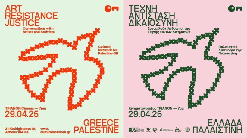 Η εκδήλωση θα πραγματοποιηθεί την Τρίτη 29 Απριλίου, ώρα 7μμ στον κινηματογράφο ΤΡΙΑΝΟΝ με τίτλο: Τέχνη – Αντίσταση – Δικαιοσύνη: Ελλάδα -Παλαιστίνη, Κάνοντας το αίτημα για δικαιοσύνη πράξη μέσα από την τέχνη