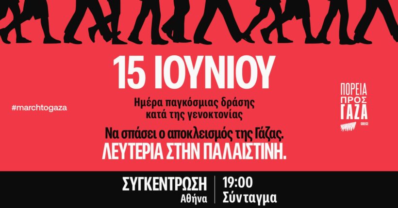 Στις 15 Ιουνίου, ας δώσουμε ένα ακόμα πιο ηχηρό μήνυμα. Σε κάθε πόλη, σε κάθε χώρα, ας σμίξουν οι καρδιές μας με τον αγωνιζόμενο λαό της Γάζας. Ας φωνάξουμε στην ελληνική κυβέρνηση και σε όλες τις κυβερνήσεις της Ε.Ε. ότι απαιτούμε να σταματήσουν να παρακολουθούν μια εν εξελίξει γενοκτονία στηρίζοντας το Ισραήλ και συνεργαζόμενες πολιτικά, εμπορικά και στρατιωτικά μαζί του!