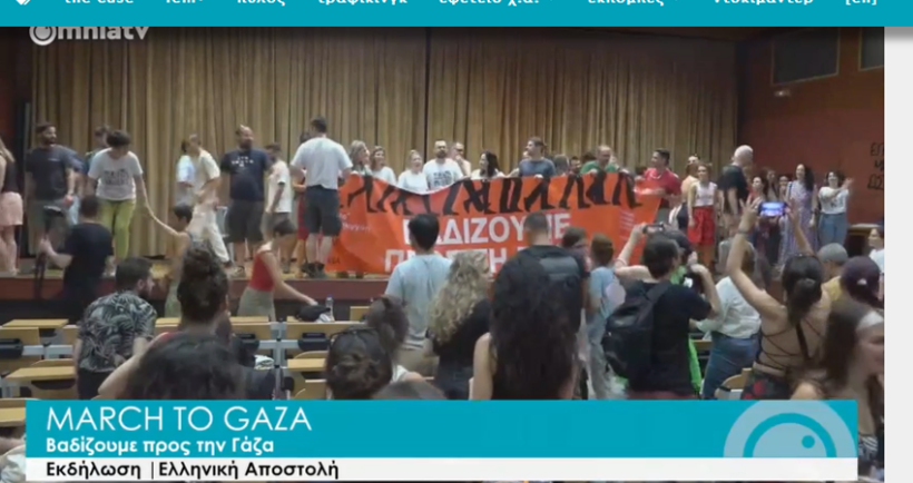 Η ελληνική αποστολή διοργάνωσε σήμερα στο Πάντειο εκδήλωση με τίτλο “Βαδίζουμε προς τη Γάζα”, η οποία μεταδόθηκε ζωντανά από το omnia tv. Ακολουθεί ο σύνδεσμος, όπου μπορείτε να δείτε την εκδήλωση: