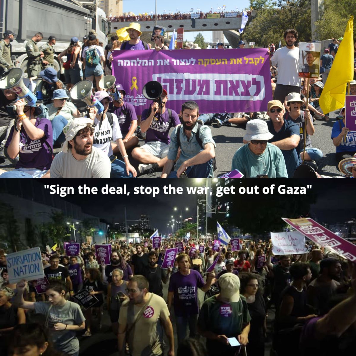 “Την περασμένη Κυριακή χιλιάδες βγήκαμε στους δρόμους, φοιτητές/τριες, ηλικιωμένοι/ες, γονείς, παιδιά – από την Ιερουσαλήμ μέχρι τη Χάιφα, από το Μπερ Σέβα μέχρι το Τελ Αβίβ – για να υψώσουμε τη φωνή μας για τους Παλαιστινίους στη Γάζα και για τους Ισραηλινούς ομήρους. Ήταν πραγματικά μια ιστορική μέρα και δεν άφησε καμία αμφιβολία για τη στάση του κοινού. Απαιτούμε να τερματιστεί ο τρόμος, η πείνα, η καταστροφή και ο θάνατος. Το μήνυμα προς την κυβέρνησή μας δεν θα μπορούσε να είναι πιο σαφές. [..] Ως λαϊκό κίνημα που αγωνίζεται για ένα διαφορετικό μέλλον, γνωρίζουμε ότι οι διαμαρτυρίες απλά δεν αρκούν. Το επόμενο βήμα πρέπει να είναι η οργάνωση και η μετατροπή της δημόσιας ενέργειας σε πολιτική δύναμη, ώστε να τερματιστεί επιτέλους αυτή η τρέλα. Πρέπει να κάνουμε πολύ, πολύ πιο δύσκολο για την κυβέρνησή μας να υλοποιήσει τα τρομακτικά σχέδια που έχει για τους Παλαιστινίους στη Γάζα, για τους Παλαιστινίους στη Δυτική Όχθη και για όλους εμάς εδώ. Για να το κάνουμε αυτό, πρέπει να συνεχίσουμε να διαταράσσουμε την καθημερινή ρουτίνα με τρόπο που να καθιστά αδύνατη την κανονική λειτουργία της κοινωνίας μας, να κάνουμε απεργίες και να κλείνουμε επιχειρήσεις ως μορφή πίεσης προς την κυβέρνηση, και να αρνηθούμε να καταλάβουμε τη Γάζα και να οδηγήσουμε τους ομήρους στο θάνατο.” Αυτά λέει η ανακοίνωση της Standing Together, οργάνωση στην οποία συμμετέχουν Εβραίοι και Άραβες κάτοικοι του Ισραήλ, που ένωσε τις δυνάμεις της με μεγάλο μέρος της κοινωνίας που εναντιώνεται ηχηρά στις ακροδεξιές και γενοκτονικές πολιτικές της ηγεσίας του κράτους του Ισραήλ.