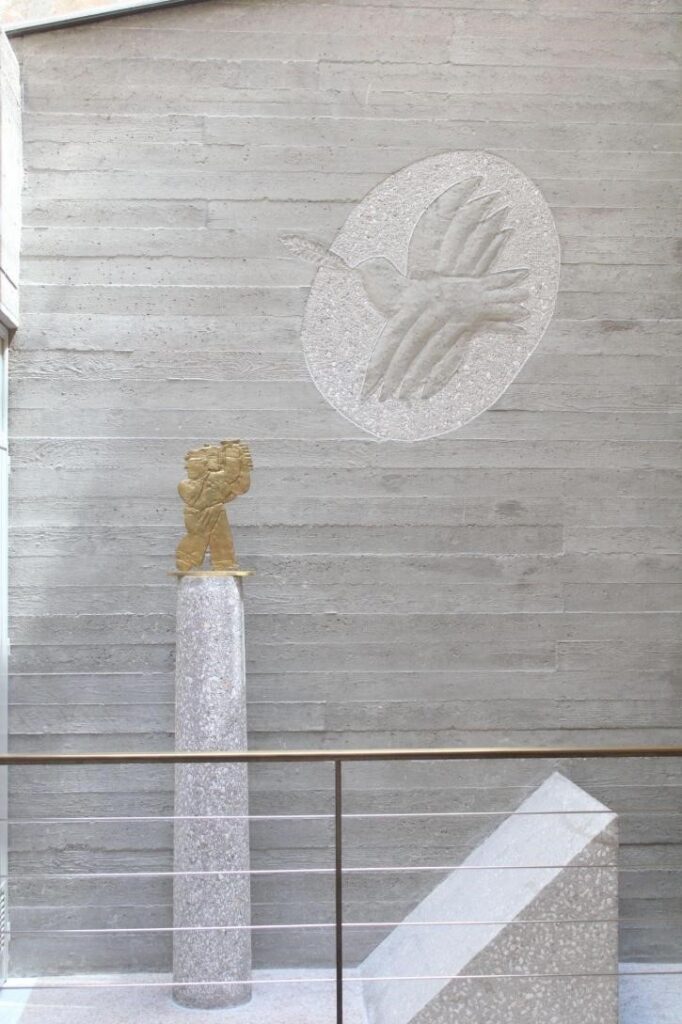 Εμείς είχαμε εκεί τον χώρο, το Μουσείο. Από μόνο του το αρχιτεκτόνημα είναι πολύ ιδιαίτερο. Οπότε το συνδυάσαμε. Είναι από τα λίγα Μουσεία στον κόσμο που συνομιλεί τόσο με τον καλλιτέχνη και εκείνος είχε άμεση επαφή με την κατασκευή του οικήματος.