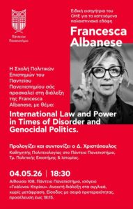 Η σχολή Πολιτικών Επιστημών του Παντείου Πανεπιστημίου φιλοξενεί διάλεξη της Αλμπανέζε με θέμα “Διεθνές Δίκαιο και Εξουσία την περίοδο γενικευμένης αταξίας και πολιτικών γενοκτονίας”. Προλογίζει και συντονίζει ο καθηγητής Πολιτειολογίας του Παντείου Πανεπιστημίου, Δημήτρης Χριστόπουλος. Η διάλεξη είναι ανοιχτή, θα γίνει στα αγγλικά και η προσέλευση στην αίθουσα θα πραγματοποιείται έως τις 18:15, ενώ θα τηρηθεί σειρά προτεραιότητας.