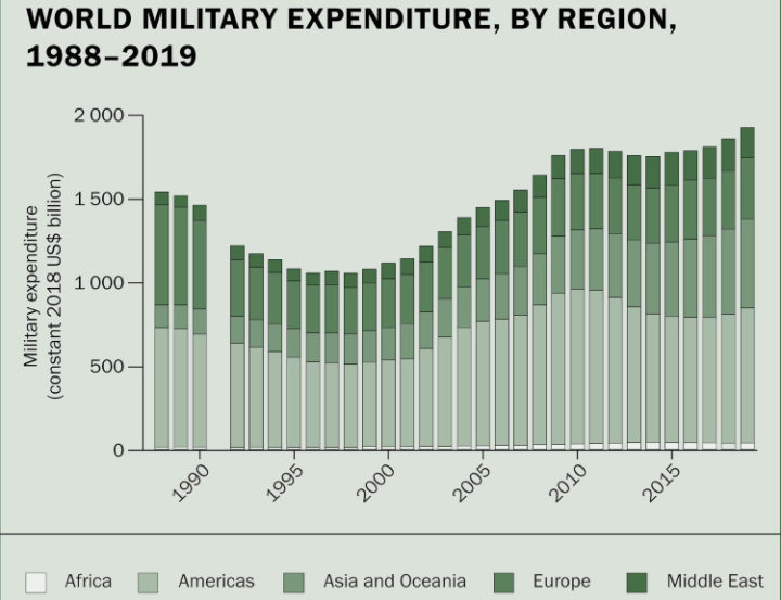 Οι συνολικές στρατιωτικές δαπάνες παγκοσμίως αυξήθηκαν στα 1917 δισεκατομμύρια δολάρια το 2019, σύμφωνα με νέα στοιχεία από το Διεθνές Ινστιτούτο Ειρήνης της Στοκχόλμης (SIPRI). Το σύνολο για το 2019 αντιπροσωπεύει αύξηση 3,6% από το 2018 και τη μεγαλύτερη ετήσια αύξηση των δαπανών από το 2010. Οι πέντε χώρες με τις μεγαλύτερες δαπάνες το 2019, που αντιστοιχούσαν στο 62% των δαπανών, ήταν οι Ηνωμένες Πολιτείες, η Κίνα, η Ινδία, η Ρωσία και Σαουδική Αραβία. Είναι η πρώτη φορά που δύο ασιατικά κράτη έχουν εμφανιστεί μεταξύ των τριών κορυφαίων στρατιωτικών δαπανών.