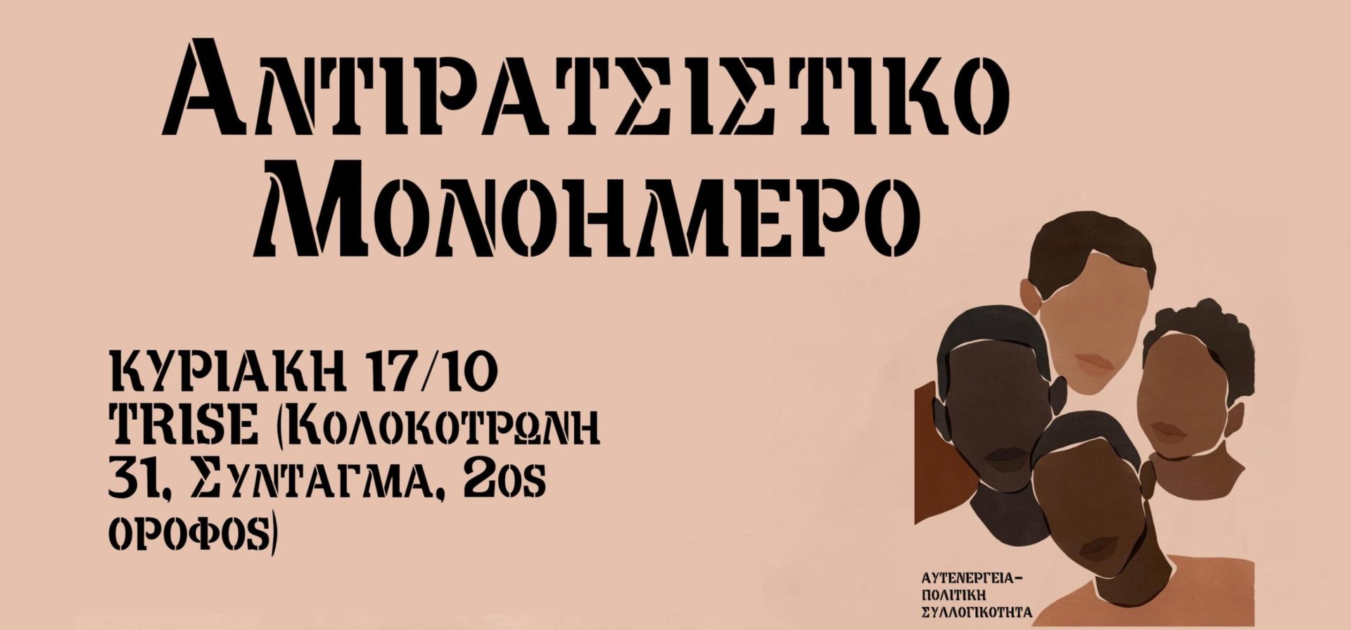 Η ΑΥΤΕΝΕΡΓΕΙΑ προσκαλεί όλες και όλους την Κυριακή 17 Οκτώβρη σε μία μέρα αντιρατσιστικών-αντιφασιστικών εκδηλώσεων στον αυτοδιαχειριζόμενο χώρο του TRISE: 》4.30μμ-6.30μμ: Αφήγηση λαϊκών αντιφασιστικών παραμυθιών & εργαστήρι ζωγραφικής. Θα ξεκινήσουμε με το εργαστήρι ζωγραφικής για παιδιά και θα ακολουθήσει η…