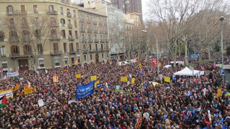 Χιλιάδες άνθρωποι συμμετείχαν στην πορεία με το σύνθημα «Θέλουμε να τους υποδεχθούμε», που οργανώθηκε από την εκστρατεία «Το σπίτι μας είναι σπίτι σας». Η κοσμοπλημμύρα καθυστέρησε την έναρξη της πορείας. Στα συνθήματα που κρατούσε ο κόσμος διάβαζες: «Καταλονία, γη υποδοχής»…