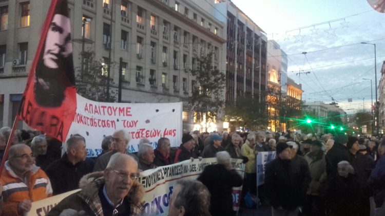Η κυκλοφορία είχε διακοπεί και η Πανεπιστημίου ήταν γεμάτη συνταξιούχους που έχουν έρθει από κάθε γωνιά της Ελλάδας (Θεσσαλονίκη, Ρέθυμνο, Κοζάνη, Σέρρες, κλπ). Οι συνεργαζόμενες συνταξιουχικές οργανώσεις του Δημοσίου, ΙΚΑ, ΟΑΕΕ, ΕΛΤΑ, ΝΑΤ, ΟΣΕ, ΠΟΣΕ – ΤΑΕ-ΟΑΕΕ με σύνθημα «Τα…