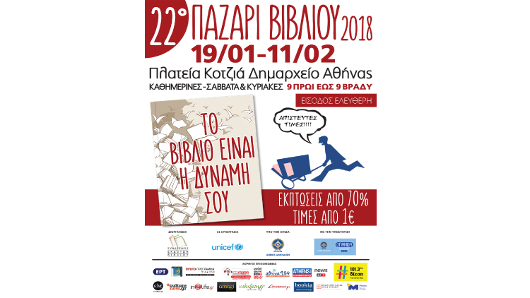 22ο ΠΑΖΑΡΙ ΒΙΒΛΙΟΥ 2018 ΠΛΑΤΕΙΑ ΚΟΤΖΙΑ ΔΗΜΑΡΧΕΙΟ ΑΘΗΝΑΣ 19 ΙΑΝΟΥΑΡΙΟΥ – 11 ΦΕΒΡΟΥΑΡΙΟΥ 2018 Ανοιχτά καθημερινά, Σάββατα και Κυριακές από 9 πρωί έως 9 βράδυ 200 εκδότες – 400.000 βιβλία – τιμές από 1 € ΔΙΟΡΓΑΝΩΣΗ: ΣΥΝΔΕΣΜΟΣ ΕΚΔΟΤΩΝ ΒΙΒΛΙΟΥ (Σ.ΕΚ.Β.)…