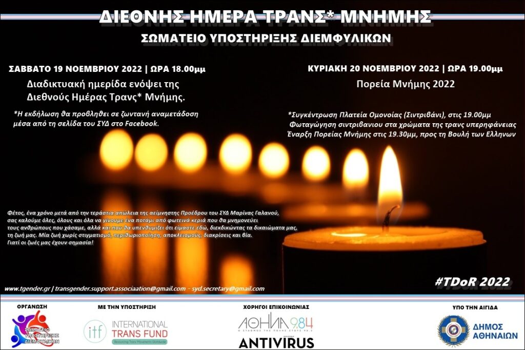 «Διήμερο Εκδηλώσεων για τη Διεθνή Ημέρα Τρανς* Μνήμης 2022 | Διαδικτυακή Ημερίδα, Σάββατο 19 Νοεμβρίου 2022, Ώρα: 18.00 | Πορεία Μνήμης, Κυριακή 20 Νοεμβρίου 2022, Ώρα: 19.00». Το Σωματείο Υποστήριξης Διεμφυλικών (Σ.Υ.Δ.), μη κυβερνητική οργάνωση εθελοντικού χαρακτήρα για την προαγωγή…