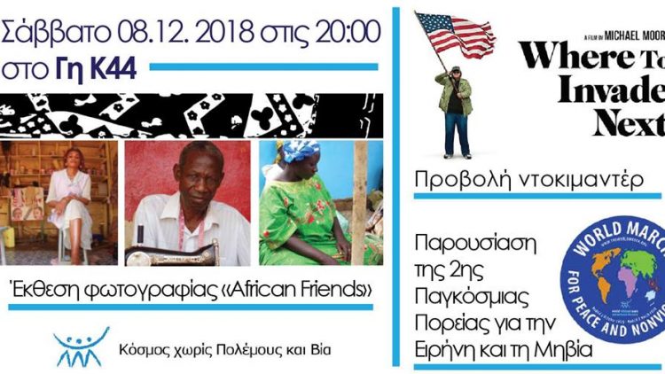 Ο «Κόσμος χωρίς Πολέμους και Βία» σας προσκαλεί σε μια βραδιά διασκέδασης και ακτιβισμού. Το Σάββατο, 8 Δεκεμβρίου στις 8 το βράδυ θα γίνει προβολή του ντοκιμαντέρ «Που να κάνετε την επόμενη εισβολή» του Μάικλ Μουρ, η παρουσίαση της 2ης…