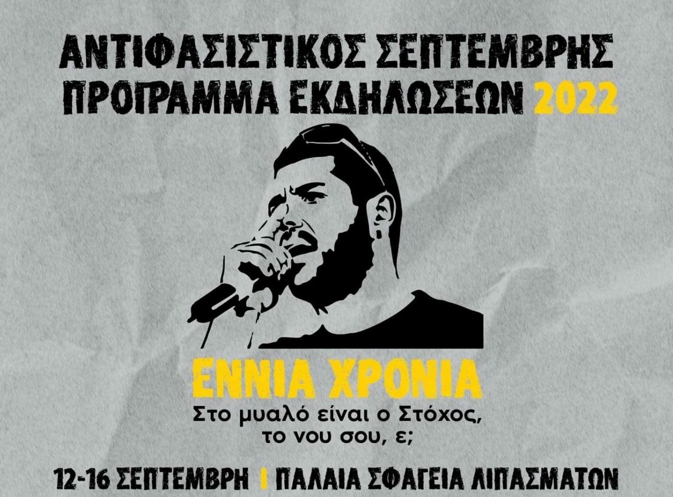Εφέτος συμπληρώνονται 9 χρόνια από τη δολοφονία του Παύλου Φύσσα στο Κερατσίνι από την εγκληματική οργάνωση της Χρυσής Αυγής. Ο Αντιφασιστικός Σεπτέμβρης είναι εδώ για να τιμήσει τη μνήμη του. Δείτε το πλήρες πρόγραμμα: 12 – 16 ΣΕΠΤΕΜΒΡΗ / ΠΑΛΑΙΑ…