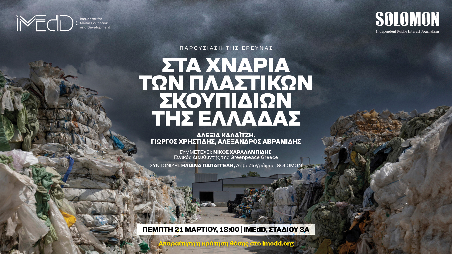 Το iMEdD σε συνεργασία με το Solomon διοργανώνουν ανοιχτή εκδήλωση για την παρουσίαση της έρευνας της Αλεξίας Καλαϊτζή, του Γιώργου Χρηστίδη και του Αλέξανδρου Αβραμίδη, με τίτλο «Στα χνάρια των πλαστικών σκουπιδιών της Ελλάδας», σχετικά με την ανακύκλωση των πλαστικών…