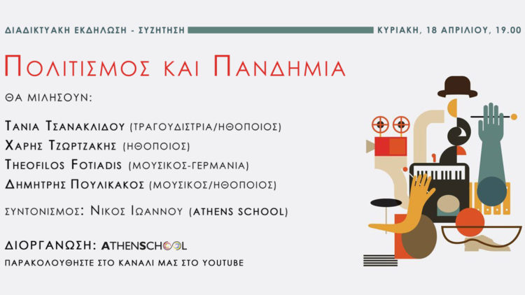 Η εκπαιδευτική ΚΟΙΝΣΕΠ Athens School διοργανώνει διαδικτυακή εκδήλωση- συζήτηση με θέμα: «ΠΟΛΙΤΙΣΜΟΣ ΚΑΙ ΠΑΝΔΗΜΙΑ», την Κυριακή, 18 Απριλίου στις 19.00. Θα μιλήσουν: Τάνια Τσανακλίδου (τραγουδίστρια/ηθοποιός) Χάρης Τζωρτζάκης (ηθοποιός) Δημήτρης Πουλικάκος (μουσικός/ηθοποιός) Πωλίνα Κρεμαστά (χορεύτρια/χορογράφος) Theofilos Fotiadis (μουσικός – Γερμανία) Συντονισμός:…