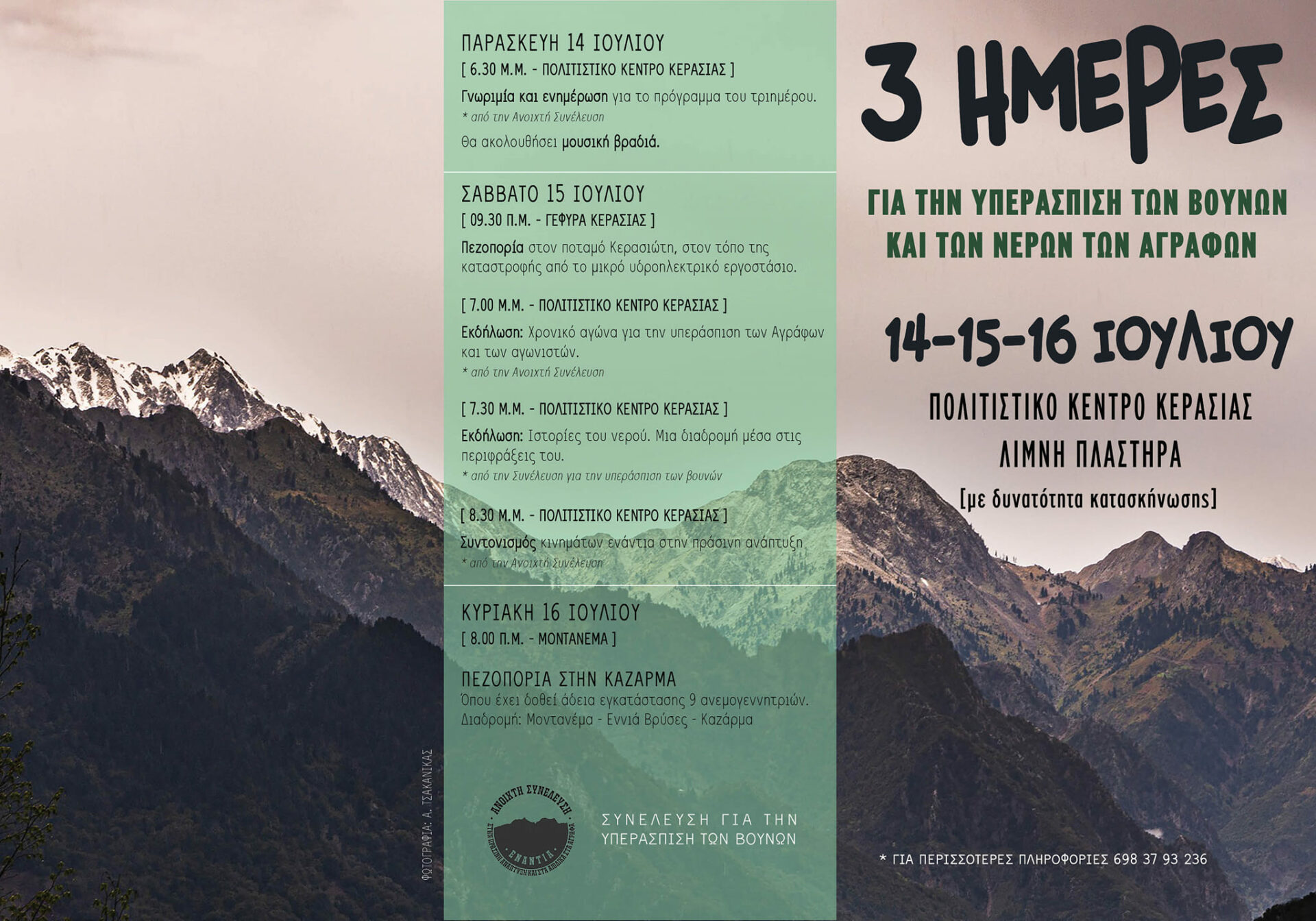14, 15 και 16 Ιουλίου, τρεις ημέρες συζητήσεων και δράσεων για την υπεράσπιση των βουνών και των νερών των Αγράφων. Να είμαστε όλοι και όλες εκεί! Παρασκευή 14 Ιουλίου 6.30 μ.μ., Πολιτιστικό Κέντρο Κερασιάς. Γνωριμία και ενημέρωση για το πρόγραμμα…