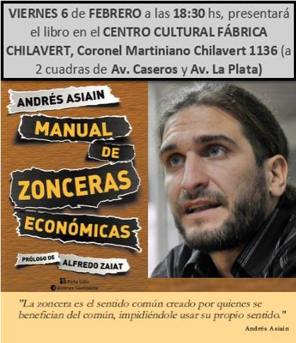 El economista Andrés Asiain presenta su nuevo libro «Manual de zonceras argentinas» prologado por el reconocido periodista Alfredo Zaiat. Los/as esperamos en Coronel Martiniano Chilavert 1136 (a 2 cuadras de Avenida Caseros y Avenida La Plata) el viernes 6 de…