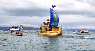 Morales llega a la Isla del Sol en la balsa Tunupa para recibir el ‘Pachakuti’