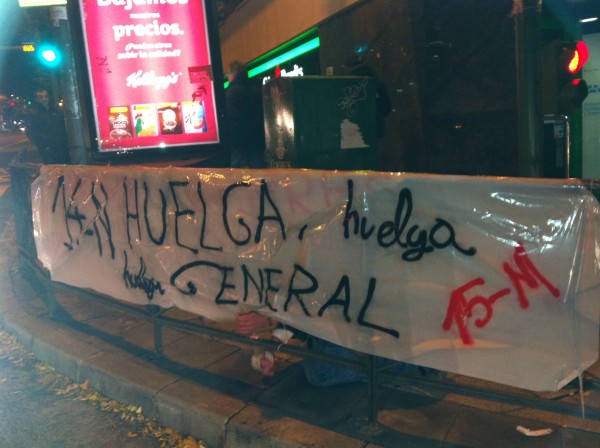 «¡El 14 N ponte de Huelga!. ¡No trabajes, no consumas y participa en las movilizaciones!». Éste es uno de los slogans que están utilizando miembros del 15M para convocar a la huelga general este miércoles 14 de noviembre. Numerosas organizaciones sindicales, políticas y sociales españolas han convocado una huelga general de 24 horas en todo el estado, que también coincidirá con paros generales en Portugal, Bélgica y Grecia y con otras movilizaciones en varios países del sur de Europa.