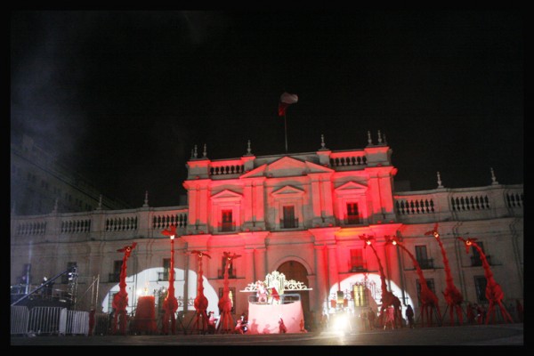 escena reflejándose en los cristales y vitrinas de los edificios santiaguinos.