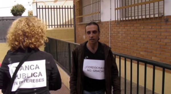 El pasado 25 de Marzo de 2012 durante la jornada electoral de las elecciones a la Junta de Andalucía, un grupo de 5 amigos y activistas sociales decidieron ir a votar portando unos folios adosados al cuerpo. En los folios podían verse frases como “¿Cerdocracia? No, Gracias”, “La banca siempre gana y no me da la gana” o “Banca publica sin intereses”. Tras pasar por dos colegios donde votaron dos de ellos, llegaron al Colegio de la barriada de Las Flores. Tras pasar por la urna y votar uno de los activistas, fueron obligados a identificarse por un policía nacional a la salida del mismo. El agente llamó a su superior y a los pocos minutos se presentaron 3 furgones policiales y unos 12 policías. Los 5 activistas fueron detenidos, llevados a comisaria, fichados y puestos en libertad con el cargo de delito contra la ley electoral.