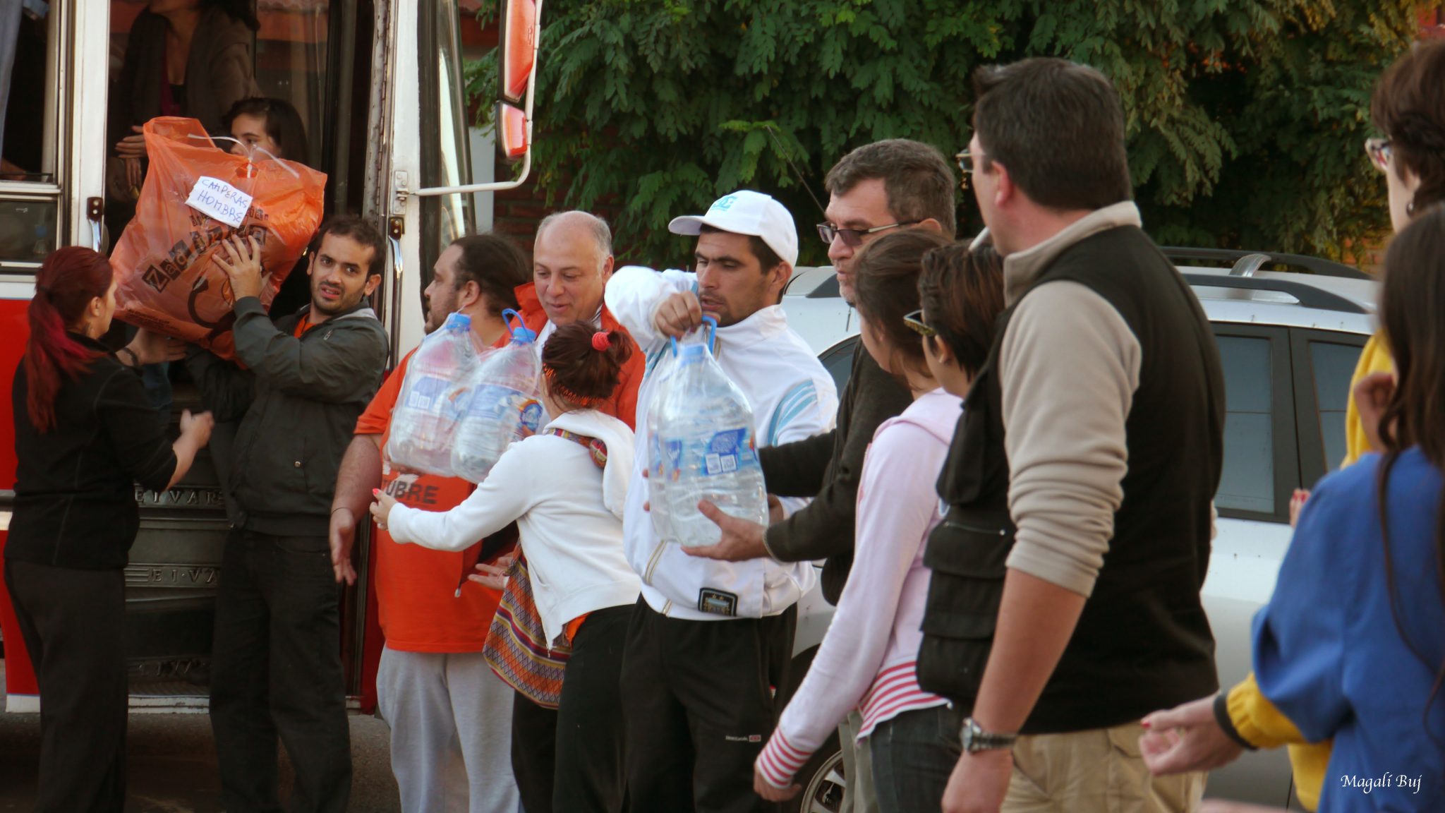 Llegamos a un centro de evacuados donde con una organización impecable se descargaba la mercadería que iba llegando, cadenas humanas que iban distribuyendo cada cosa en su lugar. Adentro algunas mujeres preparaban la merienda para una cincuentena de niños que mientras, oían atentos a un joven que les hacía juegos y pasatiempos.