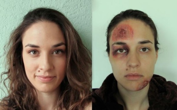 Pero de a poco, la joven aparece con la mirada triste, asustada y el rostro con moretones, lastimaduras y cortes cada vez más grandes. En la última imagen, se la ve con un cartel pidiendo ayuda desesperadamente.