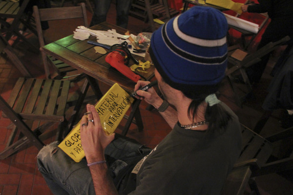 También montaron un espacio de práctica, pusieron a disposición de la gente que se acercó globitos, pedacitos de papel, pegamento, marcadores, páginas con propagandas aún sin intervención y sobre todo la posibilidad de que todos los que quisieran y se animaran pudieran acceder a esta herramienta, a este recurso de la contrapublicidad, “un espacio de práctica para que todos vean que pueden” dice Julián. Además, habrá un tiempo para contarle a la gente que venga de qué se trata el Proyecto Squatters. Julián se dedica un poco a ordenar las ideas para la charla, y nos lee lo siguiente: “Podemos usar la contrapublicidad para construir una visión crítica de la realidad, para difundir valores sociales y en definitiva para generar conciencia sobre una serie de temas que el monólogo del poder mantiene ocultos”.