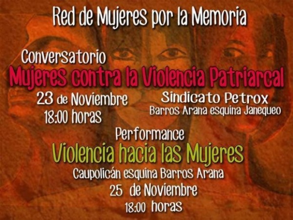 En Concepción, la Colectiva de Mujeres por la Memoria tiene dos actividades de conmemoración. Primero el sábado 23 de noviembre a las 18.00 en el sindicato de Petrox se realizará la obra de teatro “Cabaret biyoux” , creación colectiva de las diferentes formas de violencia hacia las mujeres del grupo Génesis de hualpen. Luego se realizarán los conversatorios “Mujeres en contra la violencia patriarcal”, “Virtudes públicas y pedofilia”, a cargo de Lily Rivas Labbe, y “Violencia machista en contra de las mujeres jóvenes”, a cargo de María Fernanda Barrera Mansilla.