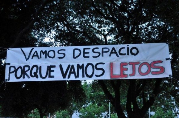 4- Una pluralidad de tiempos. Hay una contradicción irresoluble entre la aceleración brutal del tiempo de destrucción del capitalismo (que en segundos devora derechos que se conseguieron en décadas) y nuestro “vamos despacio porque vamos lejos”. ¿Entonces? Responder a la urgencia con urgencia nos agota y nos empuja a apostar por salidas simplificadas, medio redentoras y llenas de trampas. Santiago Alba Rico explica en algún sitio que estamos poseídos por una concepción hollywoodiana del tiempo (trepidante, repleto de novedades, con desenlace inmediato) que poco o nada tiene que ver con el tiempo de la transformación social verdadera (o de la vida misma). ¿Se trata entonces de darse tiempo y cultivar la paciencia? Es difícil recomendar esto en una realidad en desintegración. ¿Sería posible oponer al tiempo acelerado del capitalismo, no una lógica de la urgencia simétrica y opuesta, ni tampoco simplemente la lentitud o el largo plazo, sino una pluralidad de tiempos? Aprender a articular o movernos entre distintos tiempos: la urgencia de lo inmediato, el tiempo largo de la producción de nueva subjetividad. Desde luego es más fácil de decir que de hacer. Ni el milagro ni la construcción lineal de un edificio piso a piso, necesitamos (¡urgentemente!) otras metáforas temporales.
