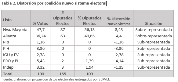 Como se observa en la Tabla 2, con el nuevo sistema electoral, el duopolio mantiene un alto índice de Distorsión. La lista de la Nueva Mayoría aumenta a un 8.43%, mientras que la lista de la Alianza disminuye levemente a un 4.40%. Sumando ambas cifras, el índice de sobre-representación del duopolio, lejos de disminuir, aumenta a un 12.83%.