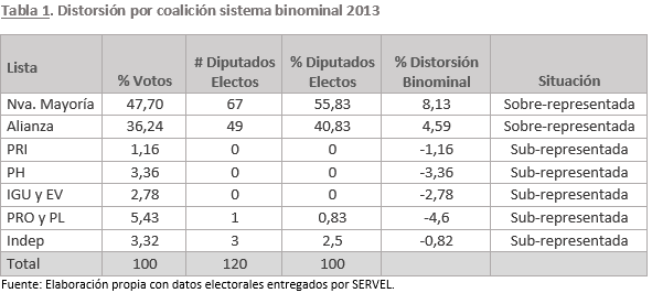 En la Tabla 1 se muestran los resultados reales del año 2013 ocupando el sistema binominal. Es observable que las dos únicas listas sobre-representadas son las de la Nueva Mayoría y la Alianza. Al sumar ambos índices de Distorsión (8.13 y 4.59) obtenemos que el duopolio tiene una sobre-representación de 12.72%. En cuanto a la Inclusividad se observa que fueron electos 4 diputados por fuera del duopolio.