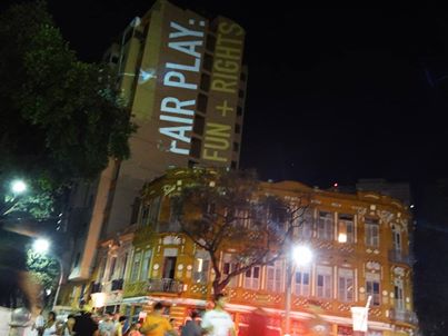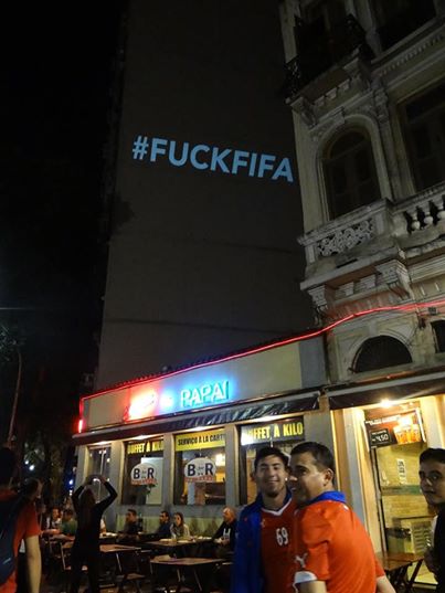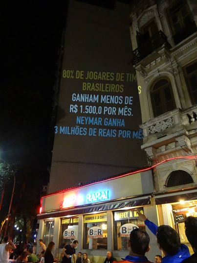 Mientras los partidos de fútbol que se juegan en Brasil ganan cada vez más espectadores frente a los aparatos de televisión, un pequeño grupo de jóvenes cariocas ha puesto en marcha una nueva manera de manifestar su rechazo al desproporcionado gasto en el que ha incurrido su país con motivo del Mundial, proyectando sobre los muros de Río de Janeiro novedosas consignas, diferentes cada noche.