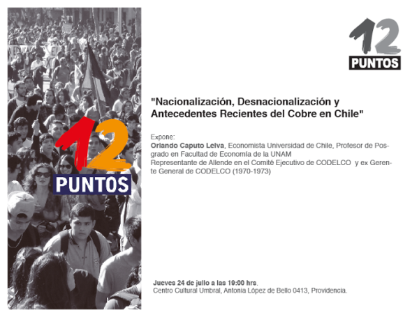 El próximo jueves 24 de julio, en el Centro Cultural Umbral (Antonia López de Bello 0413, esquina Capellán Abarzua, barrio Bellavista, Metro Salvador, Providencia, Santiago de Chile) expondrá Orlando Caputo Leiva, economista de la Universidad de Chile, Profesor de Posgrado en la Facultad de Economía de la UNAM, representante de Allende en el Comité Ejecutivo de CODELCO y ex-gerente general de CODELCO (1970-1973).