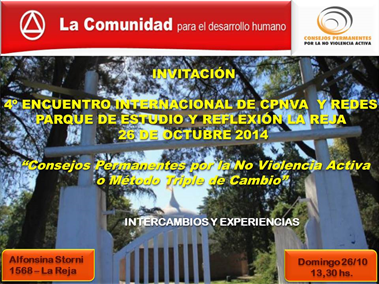 En el próximo mes de octubre, los días 24 y 25 se realizará en el Aula Magna de la «Universidad Tecnológica Nacional, UTN, Regional Buenos Aires», Medrano 950, el 4to. Encuentro Internacional Anual, sobre «Ciudades No-Violentas». Continuará el día 26 de octubre en el Parque de Estudio y Reflexión La Reja donde se profundizará sobre la experiencia interna.