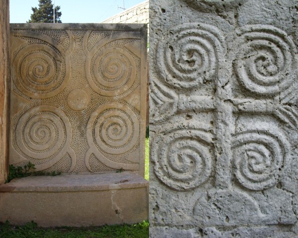Y nos encontramos con cuatro espirales simétricos también en las puertas de las tumbas rupestres de la cultura de Castelluccio, tallados en el lado que da hacia los muertos. Una de las puertas es una clara representación estilizada del acto sexual, haciendo recordar a los que han dejado el cuerpo acerca del momento de máxima vitalidad: la creación de una nueva vida. El mismo mensaje que proviene del símbolo fálico tallado en la tumba etrusca de los Demonios Alados…