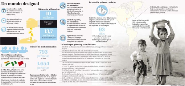 La Oxfam ha calculado que en 2014 tan solo 85 personas millonarias alimentaron la desigualdad como en ningún otro año. Estas familias acaparan fortunas equivalentes a la mitad de los más pobres de la humanidad. Entre marzo de 2013 y marzo de 2014 estas 85 personas incrementaron su riqueza en $ 668 millones diarios, un 14%.