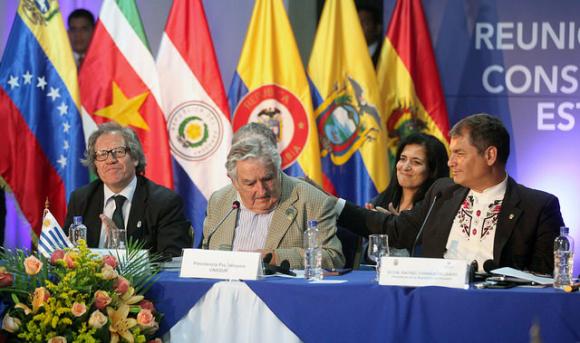 Muchas gracias, Pepe, además, por haber permitido hacer esta cumbre en Guayaquil, mi ciudad natal, que los recibe de fiesta y con los brazos abiertos. También quiero aprovechar para felicitar a Evo, Dilma, que nos va a acompañar el día de mañana, Tabaré, que no puede venir, porque como ustedes entenderán, la semana siguiente a ser electo está algo ocupado, pero nuestras felicitaciones a Evo, a Dilma, a Tabaré, mis queridos compañeros de sueños y de lucha, que con el apoyo de sus pueblos continúan o vuelven a las Presidencias de nuestros queridos Bolivia, Brasil y Uruguay. El sueño del Libertador Simón Bolívar, nuestros próceres, Francisco de Santander, Tupac Katari, Bernardo O’Higgins, Antonio José de Sucre, José Gervasio Artigas, Francisco de Miranda, José de San Martín, pero también de Ernesto Che Guevara, Salvador Allende, Néstor Kirchner, Hugo Chávez y de tantos miles de héroes y heroínas anónimos de la Patria Grande, que han sembrado su semilla libertaria, ese sueño se está convirtiendo en realidad.