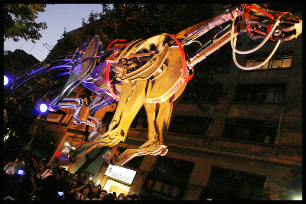 Desde huérfanos a catedral recorrió otro de los espectáculos del festival de Santiago a Mil. «El caballo de hierro» avanzó por la ciudad lentamente acompañado de melodías electrificantes y una compañía de teatro que a paso que daba, trataba de llevarlo a su salvación y liberación. Un trabajo motor finamente preparado y que cautivó entre los edificios a los espectadores y a las personas que coincidentemente caminaban por ahí. La compañía de teatro Antigua i Barbuda fue la responsable de este maravilloso evento que entre magia y sueños logró iluminar la noche.